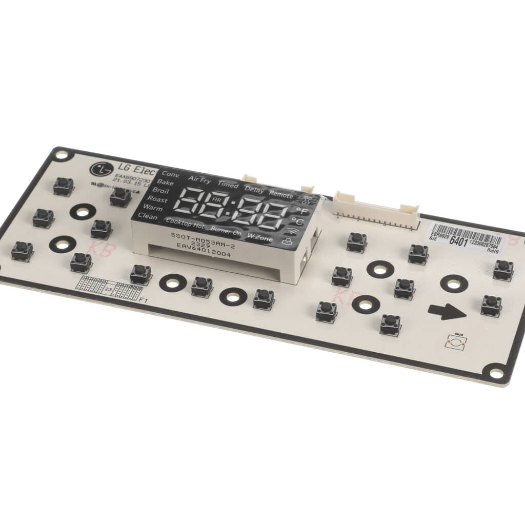 This genuine OEM item from LG ΓÇô the Display PCB Assembly ΓÇô is specifically designed for certain LG Range models. The PCB ASSEMBLY, DISPLAY is strategically engineered to receive signals from the control board, enabling it to accurately display time and temperature settings. The product's size and shape may have slight variations, ensuring a perfect fit and performance for specific LG range models. Please, remember to disconnect the power to your range or switch off the relevant circuit breaker before installation. To prevent any potential damage or injury, it is recommended to wear durable work gloves during the process. Rest assured, the PCB ASSEMBLY, DISPLAY from LG promotes efficiency and longevity in your appliance.