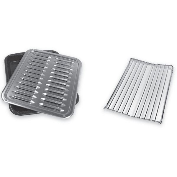 Whirlpool Maytag Premium Grey Porcelain Broil Pan and Roasting Rack W10123240 — Three-piece set includes a roasting rack, grid and broil pan — Broiler pan and grid designed to drain juices and help prevent spatter and smoke — Easy to clean grey porcelain pan — Rack holds food above the grid and allows air to circulate completely around all surfaces — Broiler Pan Measures 1 1/2"x 12 1/2" x 16 1/2" We are a re-seller for Whirlpool Maytag. Call us today for all of your Whirlpool Maytag appliance parts and accessories needs.